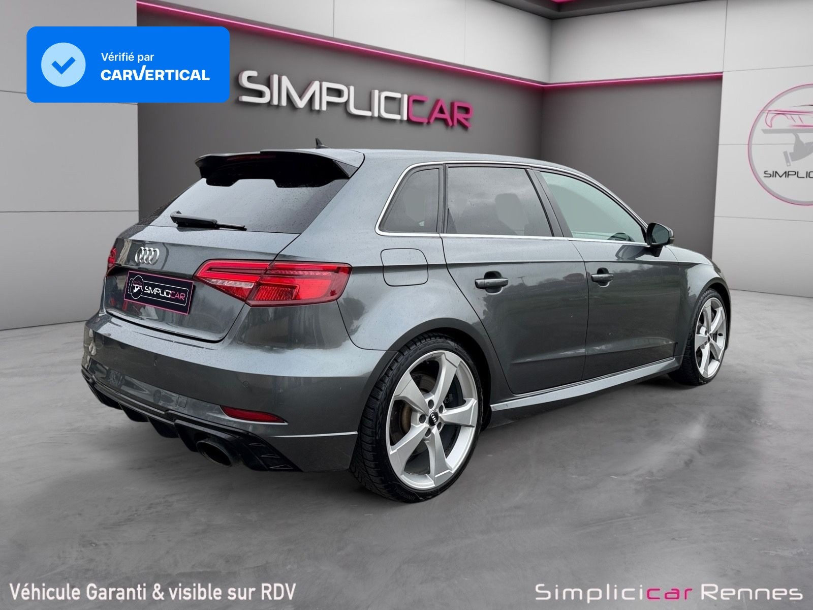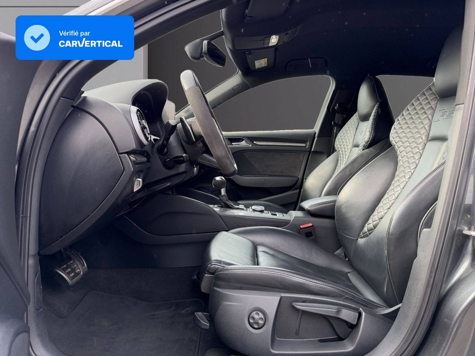 Inscription RS3 sur la calandre, le capot de coffre, les baguettes des seuils de portes, le volant Sport, le pommeau de levier de vitesse et le compte-tours