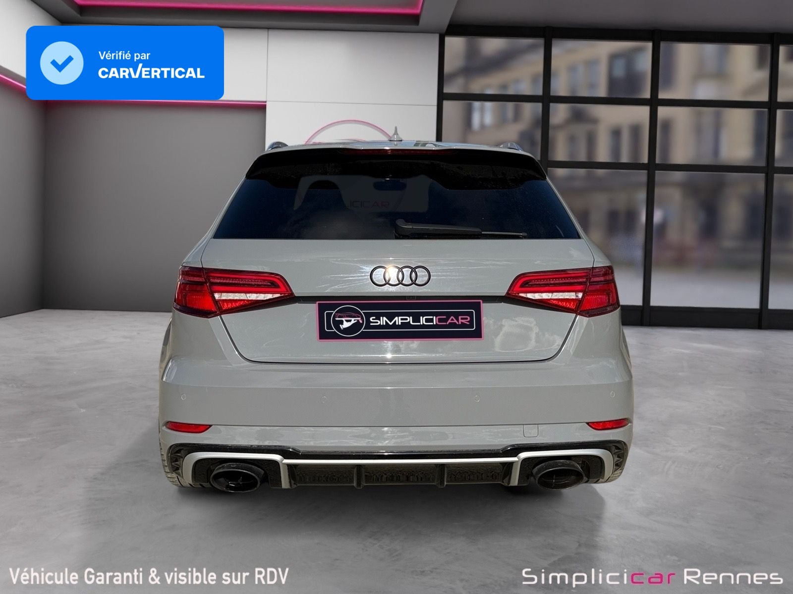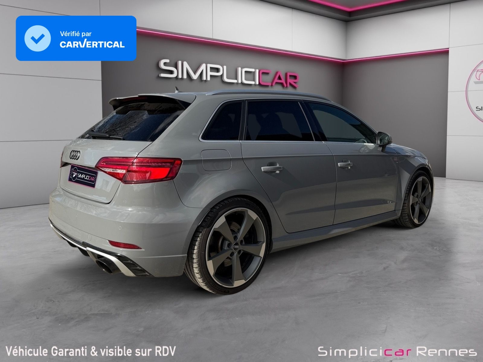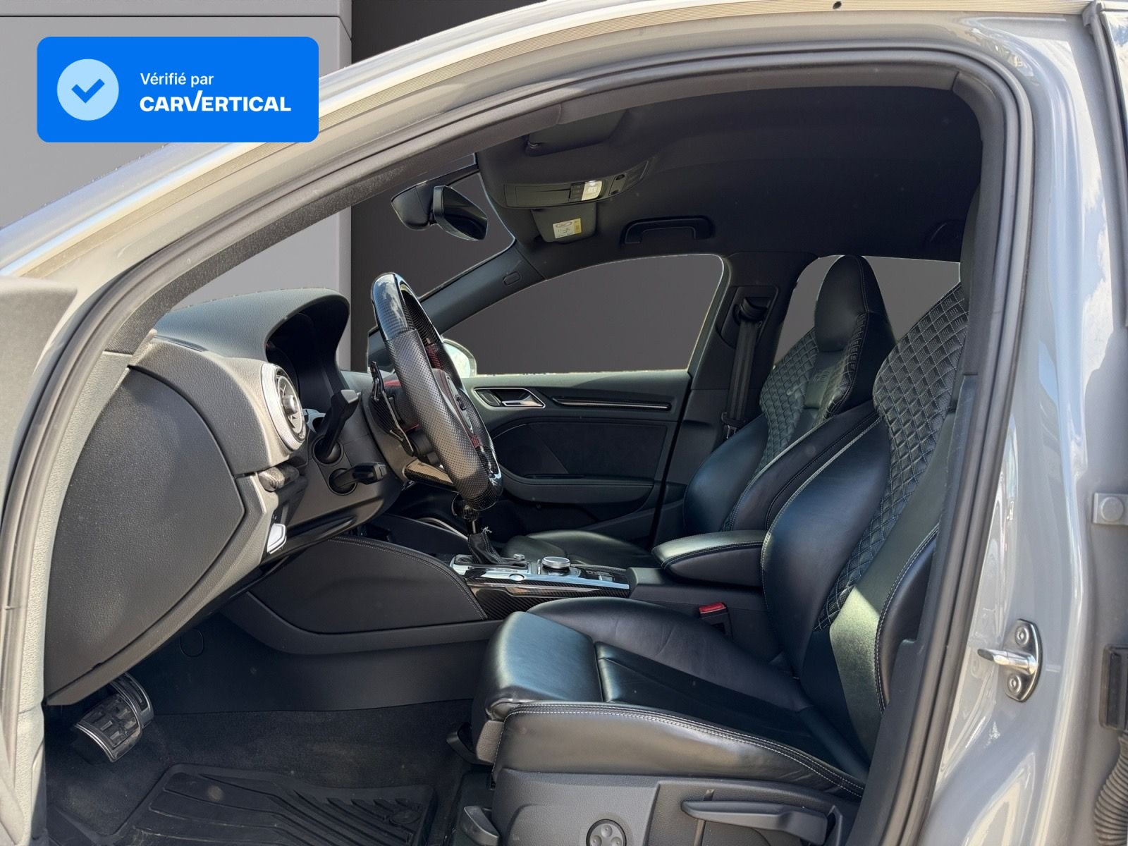 Inscription RS3 sur la calandre, le capot de coffre, les baguettes des seuils de portes, le volant Sport, le pommeau de levier de vitesse et le compte-tours